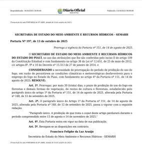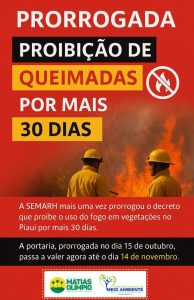 A Prefeitura de Matias Olímpio, por meio da Secretaria Municipal de Meio Ambiente e Recursos Hídricos informa que a Secretaria Estadual do Meio Ambiente (SEMARH) prorrogou a proibição do uso de fogo em áreas rurais no Piauí até 14 de novembro.